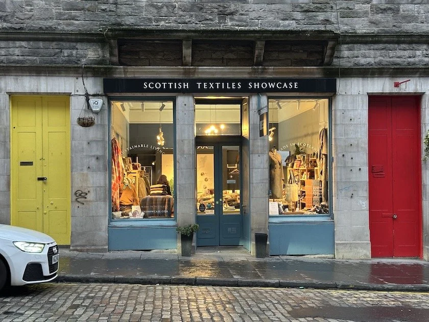 But Edinburgh’s streets seemed to have a mind of their own. In the following days, choosing a different route every time, I found myself passing the same storefront. The colorful doors were framing a sign: Scottish Textiles Showcase.